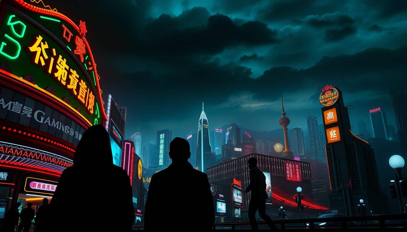 A dimly lit casino interior, the air thick with smoke and the hum of slot machines. In the foreground, a shadowy figure hunched over a gaming table, fingers rapidly manipulating the controls. Behind them, a maze of flashing screens and neon signs, casting an eerie glow. The scene is tinged with a sense of unease, as if something sinister lurks beneath the surface. The lighting is dramatic, creating deep shadows and highlights that accentuate the tension. The camera angle is low, almost from the perspective of the unsuspecting victim, heightening the sense of danger and vulnerability. This image captures the essence of the 2025 casino fraud cases - a predatory world where the line between entertainment and exploitation is blurred.